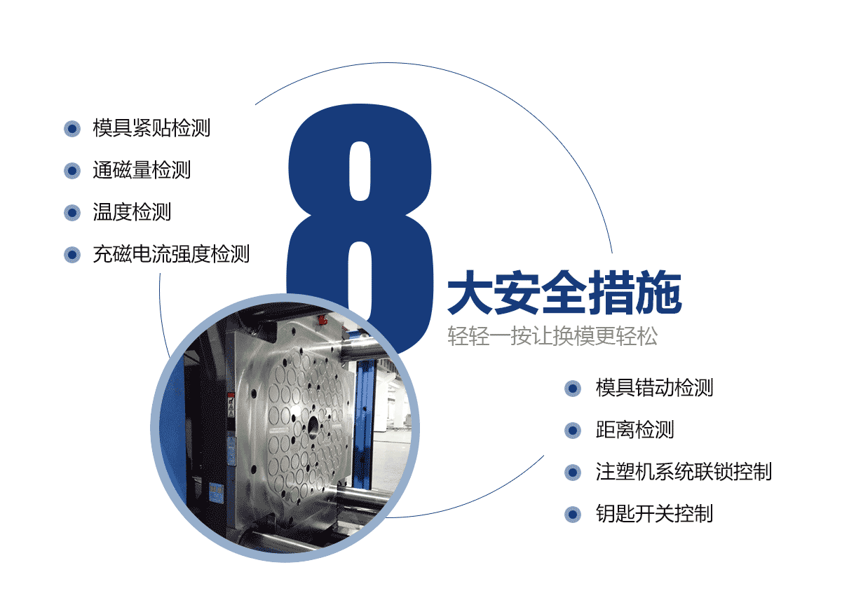 • 電永磁磁力模板適用于各種品牌的注塑機,全新的圓形磁結構,特殊的內部磁路設計,較傳統的磁力模板增加20%。